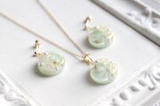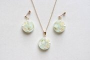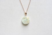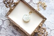 お花とパールを並べ、ホワイトとゴールドでマーブル模様を描き、背景に優しい緑色を乗せたペンダント。