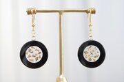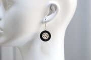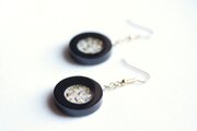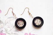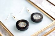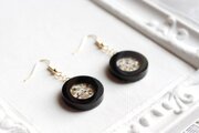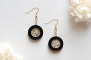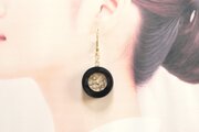 黒いレジンで透明なレジンを囲み、金箔とオレンジ色のお花を散らした、華やかで明るいピアス。