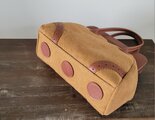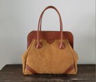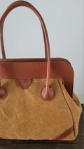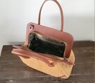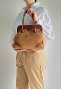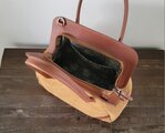 がま口のような口枠を厚めのレザーで作り、本体はジュート麻のキャンバス生地を使った、レトロ感を残したお洒落なバッグが出来ました。