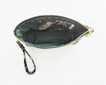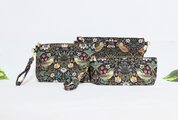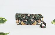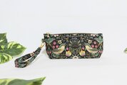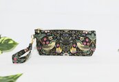 ウイリアムモリスのstrawberry thief(いちご泥棒柄)ブラック地に落ち着いた色合いのグリーン柄、綿シーチング生地の薄手で軽くて使い勝手の良い持ち手付きペンケースです。