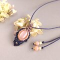 やわらかな色合いで優しい表情のピーチムーンストーンに濃い色のコードで装飾を施すことで、きりっと引き締まった表情が重なった大人な雰囲気のある作品になりました。
