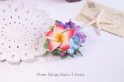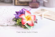赤いプルメリアとラベンダー色のデルフィニュウムのヘアクリップ 赤 髪飾り クレマチス 浴衣 フラダンス パープル 紫 髪飾り