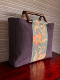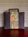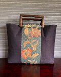 かっちりした花柄の織の八寸帯を、焦げ茶の紬と剥いで手提にしました。