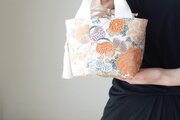 本金箔 格天花鳥文織のシルク帯で製作したミニトートバッグです。