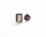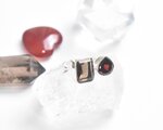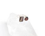 洗練された長方形のスモーキークォーツと煌めく丸みを帯びたマロンカットのガーネットを組み合わせたシンプルながらも存在感のあるデザインのシルバーリング。
