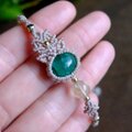 透明感はありませんが、鮮やかで深みのあるエメラルドグリーンカラーが魅力的で印象的なコロンビア産のエメラルドと良質なルチルクォーツを組み合わせたアシンメトリデザインのマクラメ編みブレスレットです。