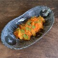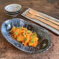 深みのある色合いのため、彩のあるサラダや季節の野菜の和え物、カルパッチョなどが映えます。料理を皿の周囲にある書き落とし模様が囲み、料理の盛り付けが引き立ちます。