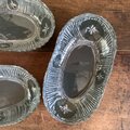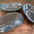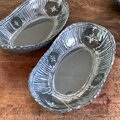 黒泥土を使った楕円型の皿に、白化粧を彫刻刀で書き落とした模様で囲みました。黒い土を背後に削り残った白い線が並び、木版画のような素朴な雰囲気の皿を狙いました。