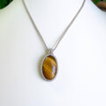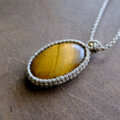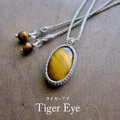光や見る角度で、金色の縞模様がキラリと煌めく天然石タイガーアイ(虎目石)のマクラメ編みペンダントです。石全体に艶やかで魅惑的なゴールドの輝きと力強さを感じられるタイガーアイを、シンプルなデザインながらも胸元で華やかに輝く印象的なアクセサリーに仕上げました。
