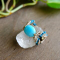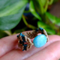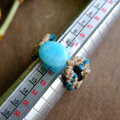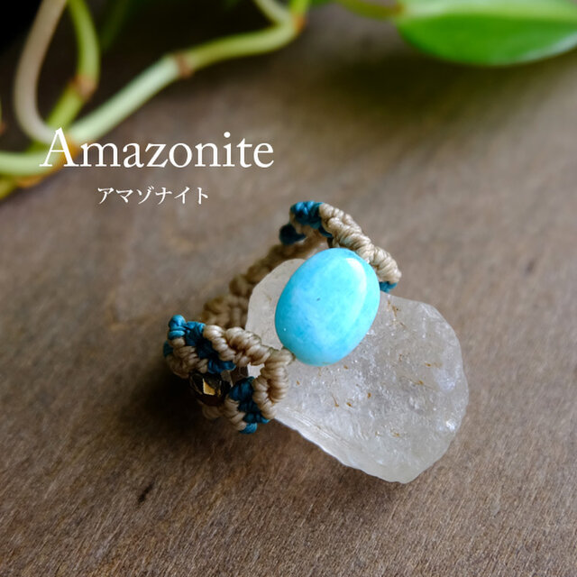 爽やかなブルーグリーンの優しい色合いが印象的なペルー産アマゾナイトのマクラメ編みリングです。愛らしく良質なアマゾナイトを2色のコードで丁寧に編み込んで魅力的な指輪に仕上げました。