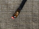 中綿を入れ、黒の正絹の着物で作ったループを付け、ループの先に、虎目石と山サンゴを付けています。