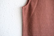 リネンの通気性の良さや柔らかさとコットンの強さを兼ね備えていて、軽く、蒸れずに、心地よい肌触りでさらっと着られます。首回りは丸首でほどよく空いていて、ノースリーブのため、着重ねの幅も広く、インナーとしてとても使いやすいです。