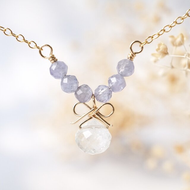 「勿忘草の花束」ネックレス タンザナイト ホワイトトパーズ リボン 天然石 誕生石 クリア ゴールド 14kgf