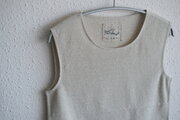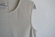 リネン80%、コットン20%のノースリーブのニット。商品名にはアンダーウェアとありますが、襟ぐりは空きすぎず、形も体の線を拾わない編み地と色、デザインパターンのため、カットソーとして着られる方も多いです。