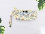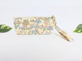 ベージュの綿キャンパス生地に北欧の森に住む可愛い動物と花々柄、ちょっと大きめサイズの持ち手付きペンケースです。