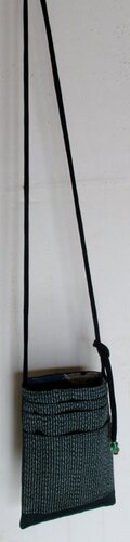 中綿を入れ、黒の正絹の着物で作ったループを付け、ループの先にトンボ玉と山サンゴを付けています。