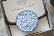 草花をモチーフに消しゴムはんこを彫り、はんこを陶土に捺しつけて凹凸の模様をつけたヘアゴムです。