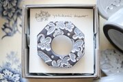 草花をモチーフに消しゴムはんこを彫り、はんこを陶土に捺しつけて凹凸の模様をつけたブローチです。