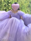 実例写真!カラードレス オーキッド オフショルダー チュールドレス くるみボタン フリル袖 ふわふわドレス 謝恩会