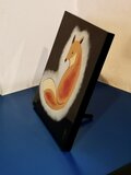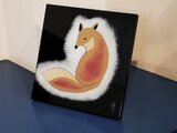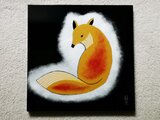 20.5センチ角の黒漆塗りのボードに、色漆や銀粉で「きつね」を描いた額で、壁に掛けることもできますが、卓上に立てても飾れます。
