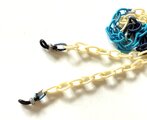 メガネに取り付ける部分のチェーン左右の端の部分と 各色の間に ほぼ同じおおきさと色の エナメル加工された金属を輸入して使っています。
