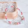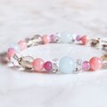 幸せな結婚を象徴すると共に子宝に恵まれる石としても人気のアクアマリン、強力な癒しと恋愛をもたらす効果のあるインカローズ、満ち足りた気持ちと深い愛情に恵まれるルビーなどを組み合わせた、女性に嬉しいパワーに満ちた天然石ブレスレットです。
