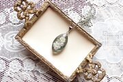 ほのかにデリケートな淡いグレーの背景にお花とパール、ブリオンをあしらった可憐なペンダント。