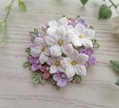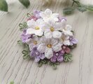 ジャスミンの花びらは上質なフランス製の真っ白なレース糸で編みました。花芯には優しい黄色のレース糸でステッチを施しました。小さな野の花はパープルやピンクのレース糸や刺繡糸を使用し、花芯にはとても小さなパールビーズを縫い留めております。
