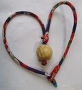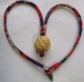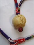 花柄の着物で作ったループを使い、首の後ろに、虎目石の玉とトルコ石、未(ひつじ)の干支の下にナチュラルサンゴの玉を付けています。