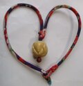 下げひもの先を、輪っかにして、虎目石の玉とトルコ石のついた方を通すようにしています。
