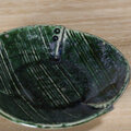 織部の色は、黄色や青色が混じって深緑色になり、釉薬の濃度が濃い部分は結晶が出ます。