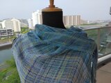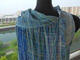 手織の布から仕立てましたブラウスです。色合いはブルー系です。大変細い糸で織りましたので柔らかな薄い布が出来ました。前身ごろは襟もとはマフラーの感じ、身頃は斜めに柔らかなドレープが出ています。後ろ身頃は横布です。(ただし後ろ前さかさまにしてもお召しいただけます)胸幅背幅50センチ。着丈長いところは75センチ短いところは65センチです。