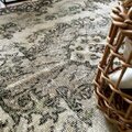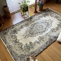 中央には繊細なメダリオン模様が描かれ、周囲を囲むように施された草花の装飾がラグ全体に優雅な印象を与えています。ヴィンテージならではの擦れ感や色の抜け具合も、決して劣化ではなく、長く使われてきた証としてこのラグに特別な魅力を添えています。サイドはオリジナルのままで素敵です。