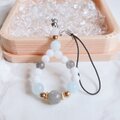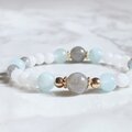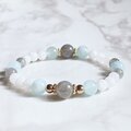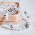 鋭いインスピレーションをもたらす力があるラブラドライトに、恋愛成就のパワーを持つムーンストーンと、幸せな結婚を象徴するアクアマリンをあしらった、上品で落ち着いた雰囲気の天然石ブレスレットです。