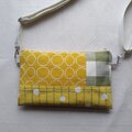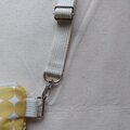 黄色ベースに白糸でドット模様を織り込んだ生地に、ライトグリーンと白の織生地と黄色に白ドットの格子柄のプリント生地を組み合わせました