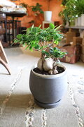 高級感のある黒っぽいグレーのスタイリッシュな陶器のコンテナに植えました。受皿付き