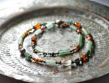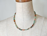 多彩グリーンローマングラスとアンティークボヘミアビーズ、民族メタル、チベタンコーラル、カーネリアン、琥珀などを繋いだネックレスです。