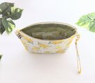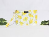 オフホワイト地に明るく爽やかなミモザの花と可愛い青い小鳥柄、綿キャンパス生地の持ち手付きポーチです。