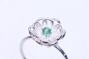 繊細なデザイン、細やかなテクスチャ、留められた硝子の美しさ。 モノクロ世界の銀色の葉に乗った朝露が そこだけ天然色を得たように緑色に光る… 光の加減によってはエメラルドの様でもあり 又パライバの様でもある朝露の色に 度々目を奪われ見惚れてしまいます。 形状上着用時に服などへのひっかかりは感じますが この指輪を着けらる幸せに比べればなんでもありません! 素敵な作品をお譲りいただき有難うございました!