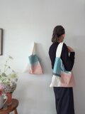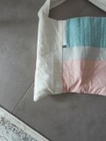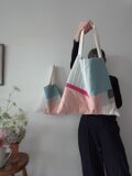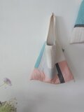 色々な布を使ったパッチワークバッグ。使用している布は全て自然素材です。キルト芯を挟み、ふんわりとしたカバンになっています。こちらは淡いピンクのコットンとブルーのリネンやコットンなど組み合わせ。内ポケット2個。持ち手は肩からかけれる長さ。使う時の形を良くするため、床置きした時bagの角は直角ではなく少し尖っています。
