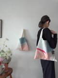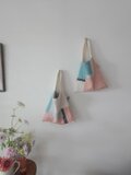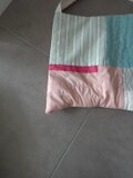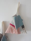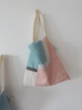 色々な布を使ったパッチワークバッグ。使用している布は全て自然素材です。キルト芯を挟み、ふんわりとしたカバンになっています。こちらは淡いピンクのコットンとブルーのリネンやコットンなど組み合わせ。内ポケット2個。持ち手は肩からかけれる長さ。使う時の形を良くするため、床置きした時bagの角は直角ではなく少し尖っています。