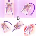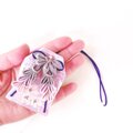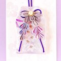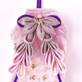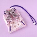 お守り袋には花をあしらい、藤をイメージした下がりをあわせました