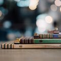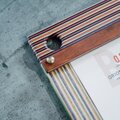 スケートボード特有の鮮やかなストライプと、ナチュラルな木材の風合いが絶妙に融合したデザインです。店舗やカフェのメニュー表示に最適で、真鍮のつまみがさらに上品な印象を与えます。