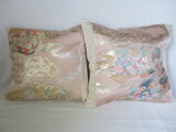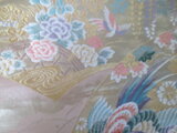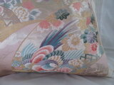 ピンクの地に細かい 四季の花 オシドリの刺繍が