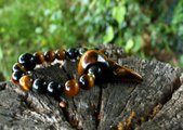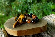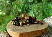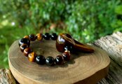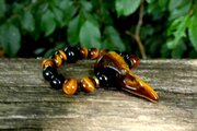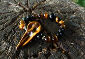 ビジネスにも良いタイガーズアイ、失敗を恐れず、日々努力を重ねていく力を応援してくれます。レインボーオブシディアンとモリオンが強力な保護作用で、マイナスのエネルギーを遠ざけ、グラウンディング力を高めてくれます。頼りになる、力強い、タイガーズアイのレイブンスカルブレスレットです。