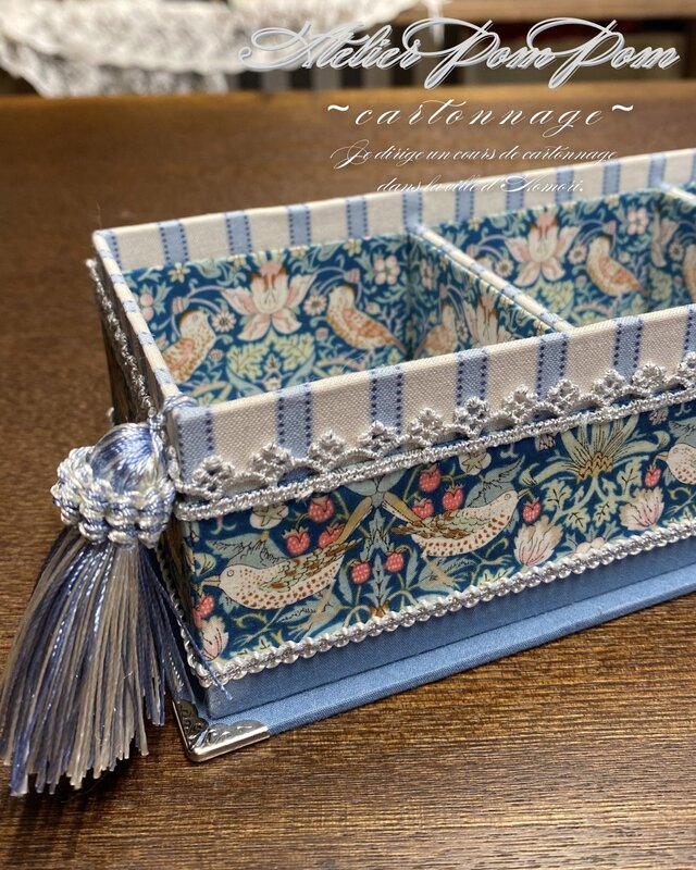 厚紙、綿布(モリス柄コットン)、タッセル、レース、金具