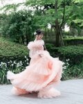 実例写真!カラードレス オフショルダー コーラルピンク 柔らかく重ねたチュールスカート プリンセスライン 結婚式 前撮り