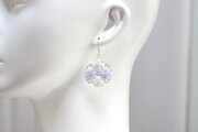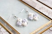 樹脂粘土で作ったホワイトと淡いブルーの紫陽花を透かしパーツに咲かせた、清楚で可憐なピアス。