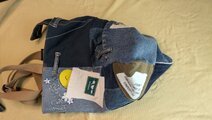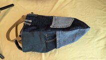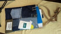 この品物はデニムなど、服の端切れを継ぎ合わせて形作っています。唯一無二の一品です。ステッチや微妙な形のゆがみがあります。これは作品に味をもたせる効果です。狙ったものではなく、結果自然に醸し出したものです。それを踏まえたうえでお買い上げくださいませ。