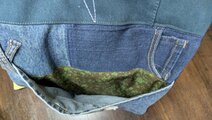 スレキ布のサイズタグ、後ポケットもとの前ボタンとボタンホールで、袋の口を留めました。